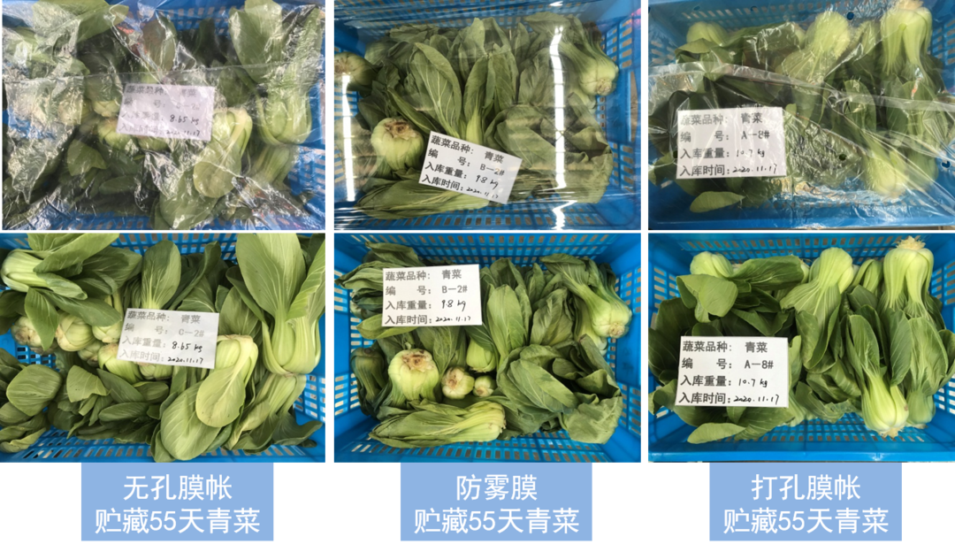 在廠內(nèi)進(jìn)行技術(shù)研發(fā)固然重要,在實踐中跟蹤驗證才能將裝備性能落實好。在廠內(nèi)完成保鮮試驗后,氣調(diào)冷藏集裝箱又馬不停蹄趕往山東壽光開展蔬菜基地陸用保鮮試驗,在北方寒冬季節(jié)里,測試設(shè)備的應(yīng)用工況,并作為氣調(diào)冷藏集裝箱走向大棚蔬菜保鮮的一次前期基礎(chǔ)性工作,全程跟蹤設(shè)備運行及試驗情況。2021年1月25日~3月11日,在貯藏45天后,除西蘭花、花椰菜、小白菜外,生菜、菠菜、油麥菜、上海青4種菜品,幾乎仍保持著剛?cè)霂鞎r的新鮮狀態(tài),失重率及折損率均不大于10%及15%。能達(dá)到此保鮮效果,也與基地果蔬好的品種與品質(zhì)有關(guān)。